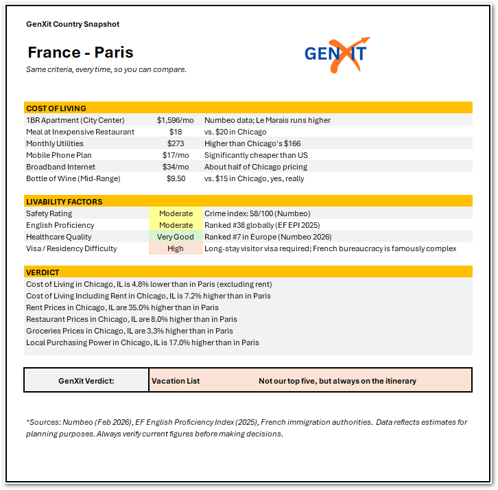 MJ spent four days in Paris as part of our GenXit country research, scouting it not only as a tourist, but as a global nomad asking the question that matters: could we actually afford to live here? Here’s what she found out about safety, walkability, cost of living, and whether the City of Light belongs on your retirement relocation shortlist.